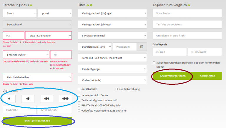 Jetzt brauchen Sie nur noch auf "Jetzt Tarife berechnen" Klicken und das Programm schmeißt Ihnen Tarife aus. Hier stehen dann auch Daten wie z.B. xx.xxx€ ersparnis gegenüber dem Grundversorger.